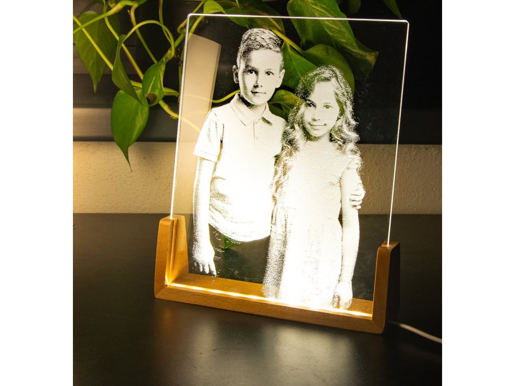 Elegantní LED lampa s gravírovanou fotografií a textem – ideální dárek pro rodinu, partnera či přátele.