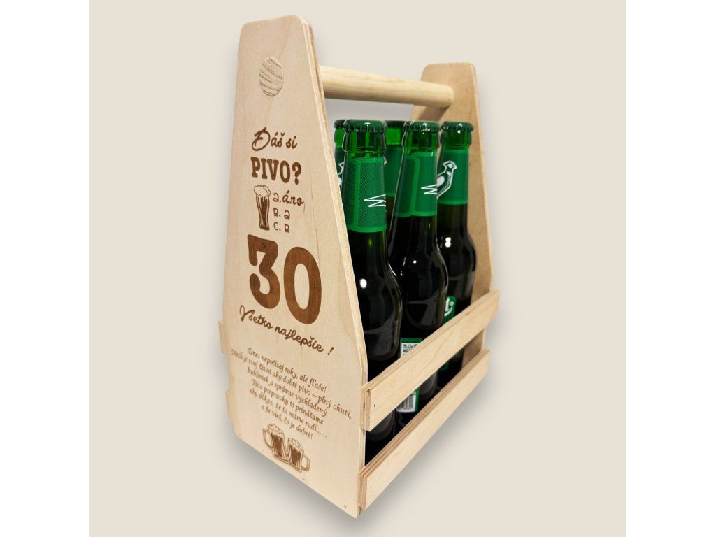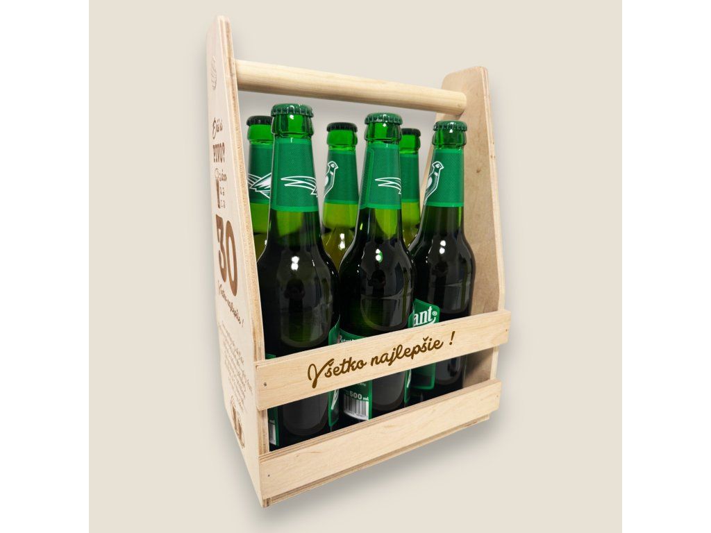 Přepravka pojme 6 klasických 0,5 l lahví piva a je vybavena pevnou dřevěnou rukojetí pro pohodlné nošení. Hodí se nejen jako praktický doplněk na oslavu, ale také jako stylová dekorace do sklepa či na chatu.